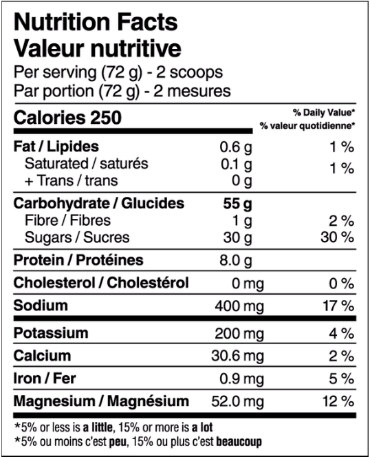 Sugars (dextrose, maltodextrin, Palatinose™ (isomaltulose)*), canola protein isolate, natural lime flavor, citric acid, sea salt, potassium citrate, magnesium citrate, spirulina extract.